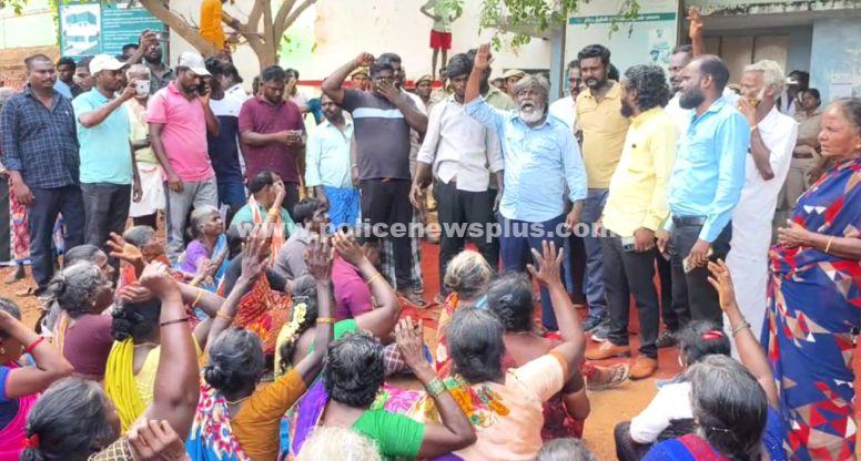 அப்போது இருதரப்பினருக்கும் இடையே தள்ளுமுள்ளு ஏற்பட்டதால் பரபரப்பு நிலவியது. பொதுமக்களை போலீசார் குண்டுகட்டாக கைது செய்து பேருந்தில் ஏற்றிய நிலையில் பெண் ஒருவர் பேருந்திலேயே புடவையால் தூக்கு மாட்ட முயன்றதால் பரபரப்பு ஏற்பட்டது. அப்போது தேர்தலில் இருந்த பெண் காவலர் அவரை சமாதானம் செய்து அப்புறப்படுத்தினார். கிராம மக்கள் சுமார் 40க்கும் மேற்பட்டோர் கைது செய்யப்பட்டு திரும்ப மண்டபத்தில் அடைக்கப்பட்ட நிலையில் ஒரு தரப்பினர் தொடர்ந்து போராட்டத்தில் ஈடுபட்டு வருகின்றனர். திரைப்பட இயக்குனர் கோபி நயினார் மக்களுடன் இணைந்து குவாரிக்கு எதிர்ப்பு தெரிவித்து முழக்கங்களை எழுப்பி ஆர்ப்பாட்டத்தில் ஈடுபட்டனர். தொடர்ந்து அதிகாரிகள் பேச்சுவார்த்தை நடத்திய நிலையில் பொதுமக்கள் காத்திருப்பு போராட்டத்தில் ஈடுபட்டுள்ளனர்.