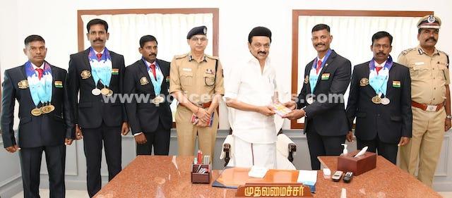 அரசின் அனுமதி பெற்று, தங்கள் சொந்த செலவில் போட்டிகளில் பங்கேற்றுள்ளனர் என குறிப்பிடத்தக்கது. பதக்கங்கள் வென்ற தமிழ்நாடு காவல்துறை வீரர்கள் முதலமைச்சர் மு.க.ஸ்டாலினை சந்தித்து வாழ்த்து பெற்றனர். இந்த நிகழ்வின்போது, காவல்துறை தலைமை இயக்குநர் திரு. சங்கர் ஜிவால், இ.கா.ப., காவல் துறை கூடுதல் இயக்குநர் (ஆயுதப்படை) திரு.எச்.எம். ஜெயராம், இ.கா.ப., ஆகியோர் உடனிருந்தனர்.