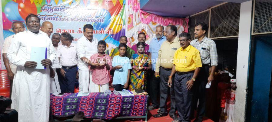 ஏ.என். ஆதிமூலம்பிள்ளை சரஸ்வதி அம்மாள் நினைவாக பள்ளியின் இரண்டு மற்றும் மூன்றாவது மதிப்பெண் பெற்ற மாணவர்களுக்கு வெள்ளிப் பதக்கத்தை மாவட்ட திட்டக்குழு உறுப்பினர் கவுன்சிலர் சத்திய பிரகாஷ் வழங்கினார். வட்டாரகல்வி அலுவலர்கள் ஷாஜகான் அகிலத்து இளவரசி, வட்டார வளமைய மேற்பார்வையாளர் தமிழ்செல்வி ஆகியோர் பரிசு வழங்கினார்கள். ராயபுரம் ஆர்.சி பள்ளி தலைமையாசிரியை பணிமாதா, சோழவந்தான் ஆர்.சி பள்ளி தலைமையாசிரியை சாந்தி அமலாஜோஸ்பின், பகல் நேரபாதுகாப்பு மைய ஆசிரியை தேவிகா, உதவி ஆசிரியைகள் பிரேம்குமாரி, கிருஷ்டி ஜெயஸ்டார், திவ்யா ஆகியோர் பேசினார்கள். மாணவ மாணவிகள் கலை நிகழ்ச்சி நடந்தது. உதவி ஆசிரியை வனிதா சாந்தகுமாரி நன்றி கூறினார்.