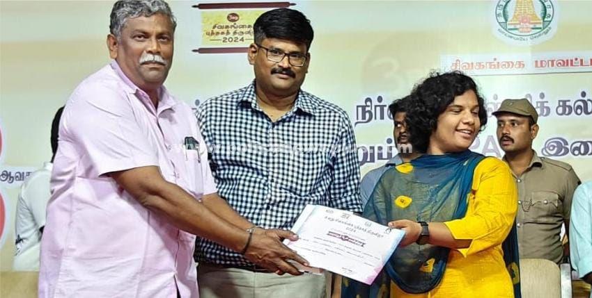 சிவகங்கை: சிவகங்கை மாவட்டம் சிவகங்கை மன்னர் மேல்நிலைப்பள்ளி அருகே நடைபெற்று வரும் மூன்றாவது புத்தகத் திருவிழாவின் நேற்று நிறைவு தினத்தை ஒட்டி சிறப்பாக செயல்பட்ட அரசு அலுவலர்களுக்கு ஆஷா அஜித் அவர்கள் விருது மற்றும் சான்றிதழ் வழங்கி கௌரவித்தார் குறிப்பாக தேவகோட்டை கோட்டாட்சியர் பால்துறைக்கு விருது மற்றும் சான்றிதழ் மாவட்ட ஆட்சியர் உயர்திரு ஆஷா அஜித் அவர்கள் வழங்கினார். உடன் மாவட்ட வருவாய் அலுவலர் உயர்திரு மோகனசுந்தரம் உள்ளபட பல அரசு அலுவலர்கள் உடன் இருந்தனர்.