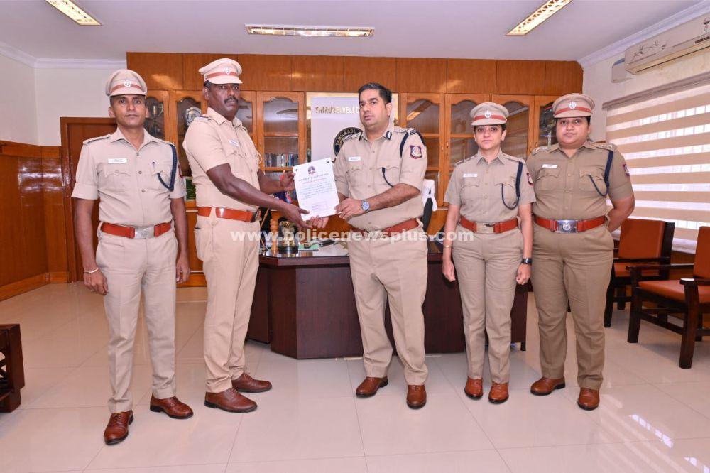 திருநெல்வேலி : திருநெல்வேலி ஒருங்கிணைந்த நீதிமன்றம் முன் கடந்த (20-12-2024)அன்று நடந்த ஒரு கொலை சம்பவத்தில் துரிதமாக செயல்பட்டு குற்றவாளியை பிடித்த சிறப்பு உதவி ஆய்வாளர், உய்க்காட்டானை திருநெல்வேலி மாநகர காவல் ஆணையர், ரூபேஷ் குமார் மீனா, இ.கா.ப., நேரில் அழைத்து பாராட்டி, சான்றிதழ் மற்றும் வெகுமதி வழங்கினார். உடன் காவல் துணை ஆணையர்கள், V.கீதா,(மேற்கு) G.S.அனிதா,(தலைமையிடம்) S.விஜயகுமார்,(கிழக்கு) ஆகியோர் கலந்து கொண்டனர்.