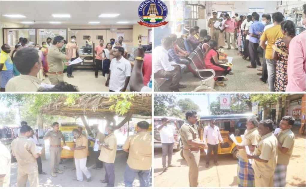 பெண்கள் நகைகள் அணிந்து கொண்டு செல்லும் போது தனியாக செல்வதை தவிர்க்க வேண்டும் எனவும் வெளியூர் மற்றும் வெளி மாநிலங்களில் இருந்து வாடகைக்கு தங்கும் நபர்களின் முழு பெயர் விபரங்கள் மற்றும் அவர்களின் புகைப்படம் உள்ள அடையாள அட்டை ஆதார் கார்டு நகல்களை வீட்டின் உரிமையாளர்கள் கண்டிப்பாக வாங்கி வைத்திருக்க வேண்டும் என்று விழிப்புணர்வை ஏற்படுத்தி விழிப்புணர்வு அடங்கிய பிரசுரங்களை கடைகளில் ஒட்டியும் பொதுமக்களிடம் வழங்கியும் விழிப்புணர்வு ஏற்படுத்தினார்கள்.