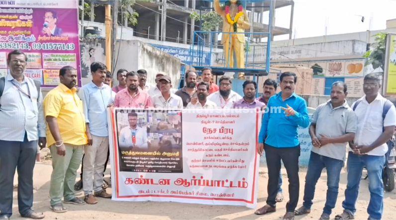 திருப்பூர்: திருப்பூர் மாவட்டம் பல்லடத்தில் தனியார் தொலைக்காட்சி செய்தியாளர் நேசபிரபு என்பவர் நேற்று இரவு மர்ம நபர்களால் சரமாரியாக வெட்டப்பட்டு படுகாயங்களுடன் கோவை தனியார் மருத்துவமனையில் தீவிர சிகிச்சை பிரிவில் அனுமதிக்கப்பட்டு சிகிச்சை பெற்று வருகிறார். குண்டர்கள் தம்மை பின் தொடர்வதாக காவல்துறையினருக்கு செய்தியாளர் தகவல் தெரிவித்தும் நடவடிக்கை எடுக்காமல் மெத்தனமாக இருந்த காவல்துறையை கண்டித்தும், தாக்குதலில் ஈடுபட்ட நபர்களை உடனடியாக கைது செய்ய கோரியும் திருவள்ளூர் மாவட்டம் பொன்னேரியில் சட்ட மேதை அண்ணல் அம்பேத்கர் சிலை முன்பாக செய்தியாளர்கள் ஆர்ப்பாட்டத்தில் ஈடுபட்டனர். கொலைவெறி தாக்குதலில் ஈடுபட்ட குண்டர்களை கைது செய்ய வேண்டும், பத்திரிக்கையாளர்கள் பாதுகாப்பு சட்டம் இயற்றிட வேண்டும் எனவும் வலியுறுத்தி முழக்கங்களை எழுப்பினர். முதலமைச்சர் உடனே தலையிட்டு நடவடிக்கை எடுத்திட வேண்டும் எனவும் ஆர்ப்பாட்டத்தில் வலியுறுத்தப்பட்டது. முடிவில் பொன்னேரி கோட்டாட்சியர் அலுவலகத்தில் கோரிக்கைகள் அடங்கிய மனுவினை செய்தியாளர்கள் அளித்தனர்.