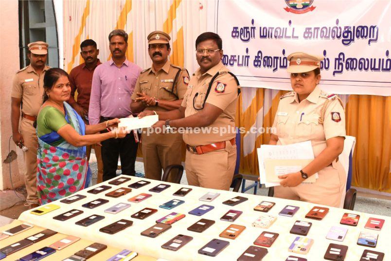 மேலும் பொதுமக்கள் மொபைல் போனில் வரும் லிங்க், யூடியூப் விளம்பரம் மற்றும் ஆன்லைன் மூலம் பொருட்கள் வாங்க பணம் அனுப்பி ஏமாந்தவர்களின் பணம் 01 கோடியே 07 லட்சம் ரூபாய் மீட்கப்பட்டு கரூர் மாவட்ட காவல் கண்காணிப்பாளர் அவர்களால் இழந்த நபர்களுக்கு ஒப்படைக்கப்பட்டது. தொலைந்து மற்றும் திருடுபோன பொருட்களை விரைவாக கண்டுபிடித்து சிறப்பாக செயல்பட்ட தலைமையிடம் (பொறுப்பு) சைபர் கிரைம் கூடுதல் காவல் கண்காணிப்பாளர் திரு. N.பிரேமானந்தன் அவர்கள் மற்றும் காவல் ஆய்வாளர் திருமதி. அம்சவேணி அவர்கள், உதவி ஆய்வாளர் திரு.சுதர்சனன் மற்றும் காவலர்கள் அனைவரையும் மாவட்ட காவல் கண்காணிப்பாளர் அவர்கள் பாராட்டினார்.