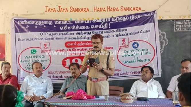 மயிலாடுதுறை: மயிலாடுதுறை ஸ்ரீ காஞ்சி சங்கர வித்யாலயா மெட்ரிக் மேல்நிலைப்பள்ளியில் இன்று (26.7.24) கூடுதல் காவல் கண்காணிப்பாளர் (Cyber Crime) முனைவர் திரு.K. சிவசங்கர் தலைமையில் சைபர் கிரைம் தொடர்பான விழிப்புணர்வு வழங்கப்பட்டது. அதில் சைபர் கிரைம் குற்றங்களிலிருந்து பொதுமக்கள் தங்களை தற்காத்துக்கொள்ள செய்யவேண்டியவைகள் குறித்தும், வலைதளங்களில் தங்கள் சுயவிவரங்களை பதிவிடாமல் இருத்தல் மற்றும் பண பரிவர்த்தனைகளில் கடைபிடிக்க வேண்டியவைகளையும் எடுத்துக்கூறி சைபர் கிரைம் தொடர்பான விழிப்புணர்வு துண்டு பிரசுரம் மாணவர்களுக்கும், ஆசிரியர்களுக்கும் வழங்கப்பட்டது. மேலும் சைபர் கிரைம் குறித்த புகாருக்கு இலவச தொலைபேசி எண். 1930 என்ற எண்ணிற்கு புகார் தெரிவிக்கவும் கேட்டுக்கொள்ளப்பட்டது. இந்நிகழ்ச்சியில் பள்ளியின் நிர்வாகி, செயலாளர் மற்றும் ஆசிரியர்கள் உடன் இருந்தனர்.