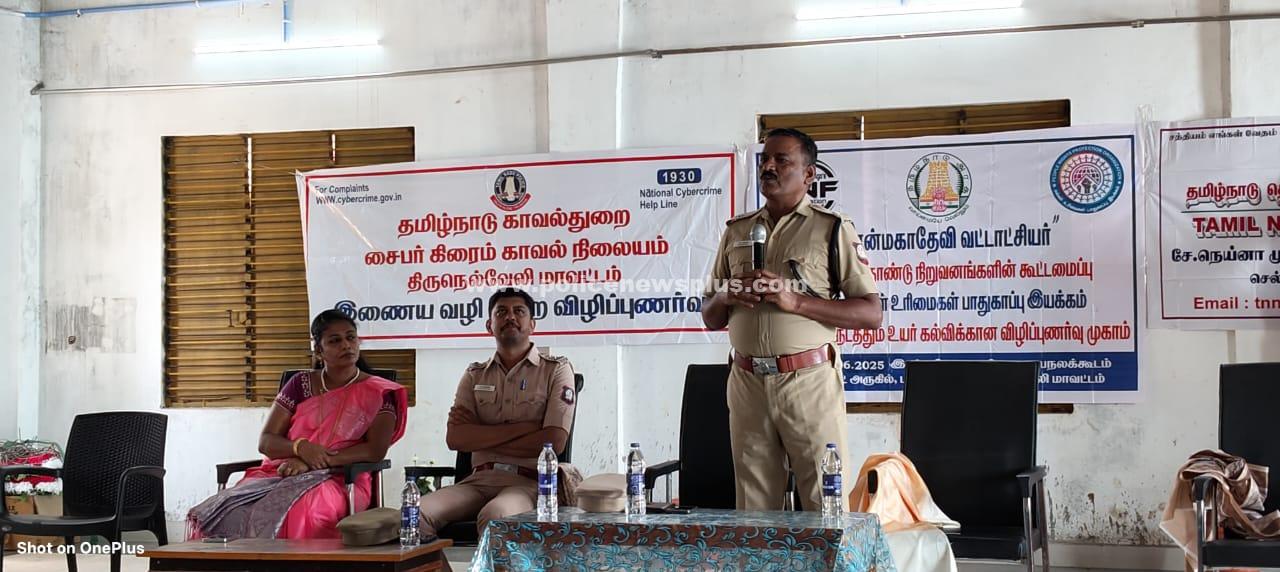 இதன் தொடர்ச்சியாக திருநெல்வேலி மாவட்டம், சேரன்மகாதேவி பாலாஜி நர்சிங் கல்லூரி மாணவ, மாணவிகளுக்கு மாவட்ட சைபர் கிரைம் கூடுதல் காவல் கண்காணிப்பாளர் முருகன், பெண்கள் சமூக வலைதளங்களில் தங்களது புகைப்படங்களை பதிவேற்றம் செய்வதால் ஏற்படும் விளைவுகள், வங்கிக் கணக்குகளின் இரகசிய எண்களை பகிர்ந்து கொள்வதாலும், முகாந்திரம் இல்லாமல் தெரியாத நபர்களிடம் வரும் வீடியோ அழைப்புகள், மற்றும் சமூக வலைத்தளங்களை எவ்வாறு கையாள வேண்டும் என்றும், சைபர் கிரைம் குற்றங்கள் நடந்தால் இலவச உதவி எண் 1930 மற்றும் (http://cybercrime.gov.in) இணையதள முகவரியில் புகார் அளிக்கவும் தெளிவாக விளக்கி விழிப்புணர்வு ஏற்படுத்தினார்.