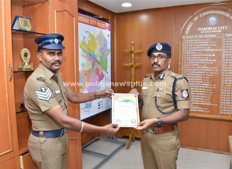 மதுரை: தல்லாகுளம் குற்றப்பிரிவு தலைமை காவலர் சரவணன், ரோந்து பணியில் இருந்தபோது நேற்று நள்ளிரவில் அரசு ராஜாஜி மருத்துவமனையில் வளாகத்தில் இருந்து சந்தேகப்படியான ஒருவர் ஓடியபோது, அவரை துரத்தி பிடித்து விசாரணை செய்ததில், அவர் மதுரை அரசு ராஜாஜி மருத்துவமனை வளாகத்தில் திருடியதாக ஒப்புக்கொண்டதன் பேரில், அவரிடமிருந்து மூன்று செல்போன்களை பறிமுதல் செய்து அரசு ராஜாஜி மருத்துவமனை காவல் நிலையத்தில் ஒப்படைத்தார். தலைமைக் காவலரின் இத்துரித செயலை, பாராட்டும் விதமாக மதுரை மாநகர ஆணையர் முனைவர் ஜெ.லோகநாதன் நேரில் அழைத்து பாராட்டி வாழ்த்துக்களை தெரிவித்து, பண வெகுமதியும் கொடுத்து கௌரவித்தார்.