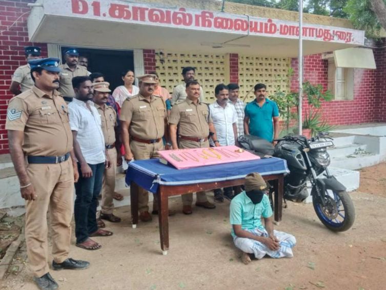 சிவகங்கை: சிவகங்கை மாவட்டம், மானாமதுரை காவல்நிலைய எல்லைக்குட்பட்ட இரயில்வே காலனிப்பகுதியைச் சேர்ந்த முத்து, த.பெ.மருது, ஜீவாநகர், மானாமதுரை என்பவரின் வீட்டில் (04.07.2024) அன்று அடையாளம் தெரியாத நபர்கள் வீட்டை உடைத்து திருடிச் சென்று விட்டதாக முத்து என்பவர் அளித்த புகாரின் பேரில் மானாமதுரை காவல் நிலையத்தில் குற்ற எண்: 315/24, U/s.331(4), 305(a) BNS-ன் படி வழக்குப்பதிவு செய்து காவல்துறையினர் குற்றவாளிகளை தேடிவந்தனர். இந்நிலையில் சிவகங்கை மாவட்ட காவல் கண்காணிப்பாளர் திரு.டோங்கரே பிரவீன் உமேஷ், இ.கா.ப., அவர்களின் உத்தரவின் பேரில், மானாமதுரை உட்கோட்ட காவல் துணைக் காவல் கண்காணிப்பாளர் திரு.கண்ணன் அவர்கள் மேற்பார்வையில், மானாமதுரை காவல் ஆய்வாளர் திரு.அலெக்ஸ்ராஜ் மற்றும் சிறப்பு சார்பு ஆய்வாளர் திரு.நாகராஜன் அவர்கள் தலைமையிலான தனிப்படையினர் குற்றவாளிகளை கைது செய்யும் பொருட்டு (19.07.2023) M.கரிசல்குளம் சோதனை சாவடியில் வாகன சோதனையில் ஈடுபட்டு கொண்டிருக்கும் போது சந்தேகத்திற்கிடமாக இருசக்கர வாகனத்தில் (TN63 BM 8997) வந்த கலையரசன், த.பெ.ராமலிங்கம், கீழக்குளம் என்பவரை விசாரணை செய்ததில் மானாமதுரை இரயில்வே காலனி ஜீவாநகர் முத்து என்பரின் வீட்டில் திருட்டு சம்பவத்தில் ஈடுபட்டது தெரிய வரவே சோதனை செய்ததில் மறைந்து வைத்திருந்த 43 சவரன் தங்க நகை மற்றும் இருசக்கர வாகனத்தையும் பறிமுதல் செய்து கைது செய்யப்பட்டார். மேலும் கலையரசனுடன் இந்த குற்றச் சம்பவத்தில் ஈடுபட்ட ஜீவாநகரைச் சேர்ந்த விஜய், அவரது தாய் செல்வி மற்றும் ஏனாதி கோட்டையைச் சேர்நத சந்தனமகாலிங்கம் ஆகியோரை விரைந்து கைது செய்ய நடவடிக்கை மேற்கொள்ளப்பட்டுள்ளது.