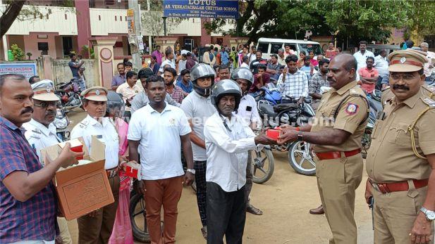 சிவகங்கை : சிவகங்கை மாவட்டம், தேவகோட்டையில் தேசிய சாலை பாதுகாப்பு தினத்தை முன்னிட்டு நகர போக்குவரத்து காவல்துறையும், ஆல் தி சில்ரன் அமைப்பும் இணைந்து திருப்பத்தூர் சாலையில் இருசக்கர வாகன ஓட்டிகளுக்கு போக்குவரத்து விதிமுறைகள் விழிப்புணர்வு டி.எஸ்.பி பார்த்திபன் தலைமையில் நடைபெற்றது. அப்பொழுது அவர் பேசுகையில் இருசக்கர வாகனத்தில் இருவர் மட்டும் செல்ல வேண்டும், கட்டாயம் தலைக்கவசம் அணிய வேண்டும், மது அருந்தி வாகனம் ஓட்டக்கூடாது,சாலை விதிமுறைகளை கட்டாயம் கடைப்பிடிக்க வேண்டும், என தெரிவித்தார் குறிப்பாக பெற்றோர்கள் தங்கள் குழந்தைகளுக்கு இரு சக்கர வாகனத்தை ஓட்டுவதற்கு அனுமதிக்க கூடாது, நம் உயிரை நாம் தான் பாதுகாத்துக் கொள்ள வேண்டும் என்று கேட்டுக் கொண்டார். ஹெல்மெட் அணிந்து வந்தவர்களை வாழ்த்தி கேக் பாக்ஸ் வழங்கினர். நகர் காவல் ஆய்வாளர் அந்தோணி செல்லத்துரை அவர்கள், சார்பு ஆய்வாளர்கள் அன்சாரி உசேன் மற்றும் சஞ்சீவ், ரெக்ஸ், மற்றும் காவல் ஆளுநர்கள் கலந்து கொண்டனர். இந்நிகழ்ச்சி ஏற்பாடுகளை போக்குவரத்து காவல் சார்பு ஆய்வாளர் அகிலன், சிறப்பு சார்பு ஆய்வாளர் கலா, போக்குவரத்து காவல் ஆளுநர்கள் மற்றும் ஆல் தி சில்ரன் ஒருங்கிணைப்பாளர் ராஜேந்திர பிரபு ஆகியோர் செய்திருந்தனர்.