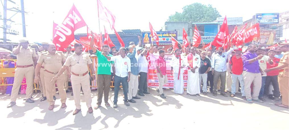 திருவள்ளூர் : திருவள்ளூர் மாவட்டம், மீஞ்சூரில் 17 அம்ச கோரிக்கை வலியுறுத்தி அனைத்து தொழிற்சங்கங்களின் சார்பில் பொது வேலை நிறுத்தம் மற்றும் மறியல் போராட்டம். நடைபெற்று வருகிறது. தொழிலாளர்களுக்கு விரோதமான நான்கு தொகுப்பு சட்டங்களை வாபஸ் வாங்கவும் விலைவாசி உயர்வினை குறைத்திடவும் அனைத்து ஒப்பந்த தொழிலாளர்களையும் நிரந்தரபடுத்தவும் பொது துறையை பாதுகாத்திடுவோம் உள்ளிட்ட 17 அம்ச கோரிக்கை வலியுறுத்தி நாடு தழுவிய அனைத்து தொழிற்சங்கங்களின் சார்பில் பொது வேலை நிறுத்தம் மற்றும் மறியல் போராட்டம் தமிழ்நாடு முழுவதும் நடைபெற்று வருகிறது.