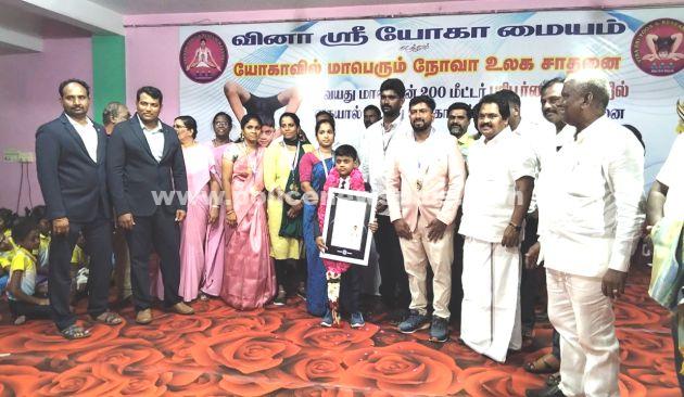 திருவள்ளூர் : திருவள்ளூர் மாவட்டம், கும்மிடிப்பண்டியில் வினா ஸ்ரீ யோகா மையம் நடத்திய யோகாவில் மாபெரும் நோவா உலக சாதனையை ஒன்பது வயது மாணவன் தர்ஷன் 254.5 மீட்டர் தூரத்தை 8 நிமிடங்களுக்குள் பரிபூர்ணா ஆசனத்தில் கையால் நடந்து யோகாவில் நோவா உலக சாதனை செய்தார். கும்மிடிப்பூண்டி செயின்ட் மேரிஸ் துவக்க பள்ளியில் நான்காம் வகுப்பு பயிலும் மாணவன் தர்ஷன். இளம் வயது முதல் யோகாவில் விருப்பம் கொண்டு கடந்த மூன்று வருட காலமாக பயிற்சி பெற்று வந்தார். தொடர்ந்து நேற்று மாலை 5 மணி கும்மிடிப்பூண்டி ரயில் நிலையத்தில் உள்ள மைதானத்தில் அமைக்கப்பட்டள்ள 200 மீட்டர் விரிப்பின் மீது பரிபூர்ணா ஆசனத்தில் கையால் நடந்து இந்த சாதனை செய்தார். வினா ஸ்ரீ யோகா மையத்தின் நிறுவனர் காளீஸ்வரன் பயிற்சி அளித்ததன் பேரில் யோகா சாதனையை முன்னாள் கும்மிடிப்பூண்டி சட்டமன்ற உறுப்பினர் கே. எஸ். விஜயகுமார் துவக்கி வைத்தார். முன்னதாக பறையாட்டம் ஒயிலாட்டம் பொய்க்கால் குதிரையுடன் கலை கட்டிய சாதனை நிகழ்ச்சியில் கும்மிடிப்பூண்டி இரயில் நிலையத்தில் உள்ள பொதுமக்கள் திரும்பி பார்க்கும் வண்ணம் புதிதாக அமைக்கப்பட்டிருந்த இரயில்வே மைதானத்தில் இந்த நிகழ்ச்சி நடைபெற்று மாணவன் 254.5 மீட்டரை கடக்கும்போது ஆரவாரம் செய்து மகிழ்ந்தனர்.