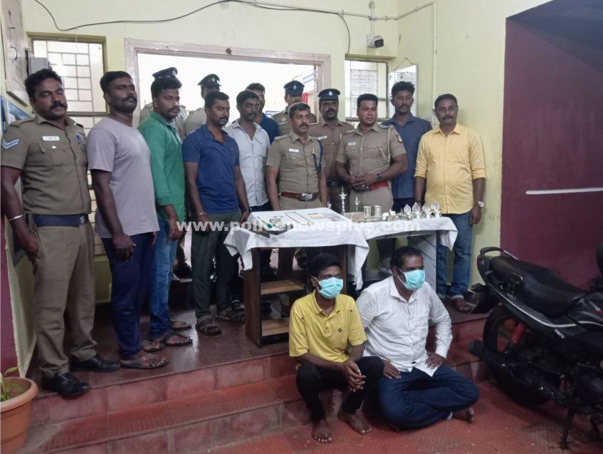 சிவகங்கை: சிவகங்கை மாவட்டம், திருப்பத்தூர் உட்கோட்டம், திருக்கோஷ்டியூர் காவல் நிலைய எல்லைக்குட்பட்ட கண்டரமாணிக்கத்தில் கடந்த (29.10.24)ம் தேதி அடையாளம் தெரியாத நபர்கள் சிதம்பரம் என்பவரது வீட்டின் கதவை உடைத்து வீட்டிலிருந்த பணம் மற்றும் நகைகளை திருடியது தொடர்பாக திருக்கோஷ்டியூர் காவல் நிலையத்தில் வழக்கு பதிவு செய்யப்பட்டது. சிவகங்கை மாவட்ட காவல் கண்காணிப்பாளர் டோங்கரே பிரவீன் உமேஷ், இ.கா.ப அவர்களது உத்தரவின் பேரில், துணைக்காவல் கண்காணிப்பாளர், செல்வக்குமார், த.கா.ப திருப்பத்தூர் உட்கோட்டம் அவர்களது மேற்பார்வையில், சார்பு ஆய்வாளர் ராஜவேல், அவர்களது தலைமையிலான தனிப்படையினர் குற்றவாளிகளை தேடி வந்த நிலையில், தேனி மாவட்டம், அல்லிநகரம், பாண்டியன் நகரைச்சேர்ந்த மாணிக்கம்பிள்ளை என்பவரது மகன் சோனிராஜா (58). மற்றும் மதுரை மாவட்டம், திருமங்கலம் தாலுகா, செக்கானூரணி, மாவிலம்பட்டியைச்சேர்ந்த முத்துப்பாண்டி என்பவரது மகன் அழகர்சாமி (35). ஆகியோர் கைது செய்யப்பட்டு அவர்களிடமிருந்து 43 சவரன் தங்க நகைகள், 21 கிலோ வெள்ளி நகைகள், ரூ.63,000/- பணம் மற்றும் இருசக்கர வாகனம் ஒன்றும் கைப்பற்றப்பட்டன. மேலும், மேற்கண்ட இருவரும் நீதிமன்ற காவலுக்கு உட்படுத்தப்பட்டன.