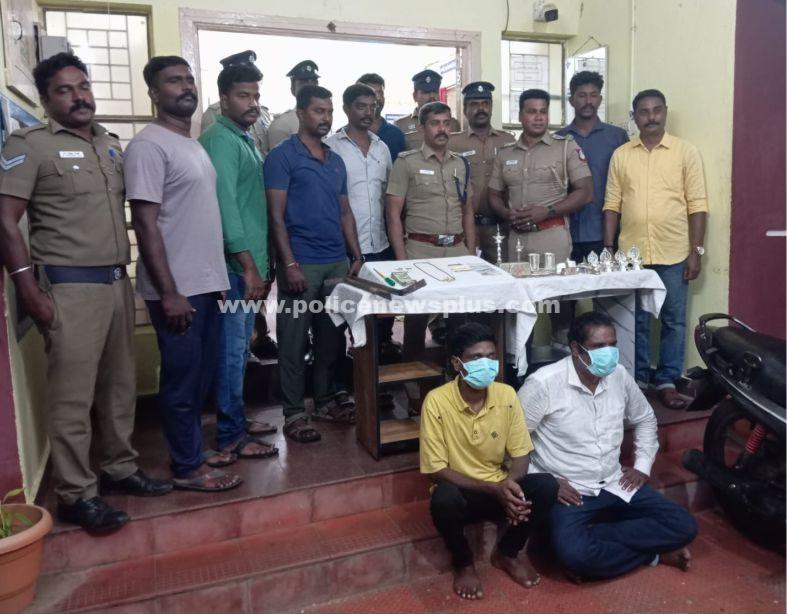 சிவகங்கை: சிவகங்கை மாவட்டம், திருப்பத்தூர் உட்கோட்டம், திருக்கோஷ்டியூர் காவல் நிலைய எல்லைக்குட்பட்ட கண்டரமாணிக்கத்தில் கடந்த (29.10.24)ம் தேதி அடையாளம் தெரியாத நபர்கள் சிதம்பரம் என்பவரது வீட்டின் கதவை உடைத்து வீட்டிலிருந்த பணம் மற்றும் நகைகளை திருடியது தொடர்பாக திருக்கோஷ்டியூர் காவல் நிலையத்தில் வழக்கு பதிவு செய்யப்பட்டது. சிவகங்கை மாவட்ட காவல் கண்காணிப்பாளர் டோங்கரே பிரவீன் உமேஷ், இ.கா.ப அவர்களது உத்தரவின் பேரில், திருப்பத்தூர் உட்கோட்டம் துணைக்காவல் கண்காணிப்பாளர், செல்வக்குமார், த.கா.ப , .அவர்களது மேற்பார்வையில் சார்பு ஆய்வாளர் ராஜவேல், அவர்களது தலைமையிலான தனிப்படையினர் குற்றவாளிகளை தேடி வந்த நிலையில், தேனி மாவட்டம், அல்லிநகரம், பாண்டியன் நகரைச்சேர்ந்த மாணிக்கம்பிள்ளை என்பவரது மகன் சோனிராஜா (58) மற்றும் மதுரை மாவட்டம், திருமங்கலம் தாலுகா, செக்கானூரணி, மாவிலம்பட்டியைச்சேர்ந்த முத்துப்பாண்டி என்பவரது மகன் அழகர்சாமி (35) ஆகியோர் கைது செய்யப்பட்டு அவர்களிடமிருந்து 43 சவரன் தங்க நகைகள், 21 கிலோ வெள்ளி நகைகள், ரூ.63,000/- பணம் மற்றும் இருசக்கர வாகனம் ஒன்றும் கைப்பற்றப்பட்டன. மேலும், மேற்கண்ட இருவரும் நீதிமன்ற காவலுக்கு உட்படுத்தினர்.