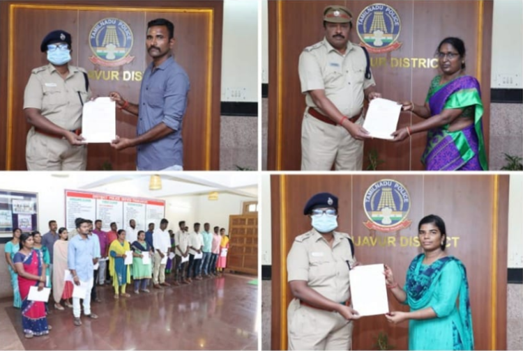 தஞ்சாவூர் : மாண்புமிகு தமிழக அரசு ஆணையின்படி, காவல் துறையில் பணியில் இருந்தபோது இறந்தவர்களின் குடும்பங்களில் உள்ள ஒருவருக்கு கருணை அடிப்படையில் வேலை வழங்கும் திட்டத்தின்படி, காவல் நிலையங்களில் உள்ள நிலைய வரவேற்பாளருக்கான பணி நியமன ஆணை (30/08/2022), தஞ்சாவூர் மாவட்ட காவல் கண்காணிப்பாளர் திருமதி.ரவளி ப்ரியா கந்தபுனேனி.இ.கா.ப. அவர்களால் வழங்கப்பட்டது.
