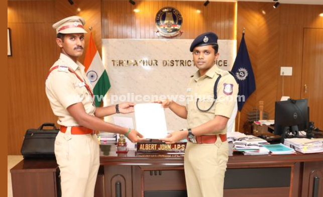 திருப்பத்தூர்: திருப்பத்தூர் மாவட்டம் நீட் தேர்வு எழுத அடையாள அட்டையை மறந்து வந்த மாணவிக்கு தக்க சமயத்தில் பதிவிறக்கம் செய்து மாணவியை தேர்வு எழுத உதவியாய் இருந்த பயிற்சி உதவி ஆய்வாளர் திரு. கணேசன் அவர்களுக்கு மாவட்ட காவல் கண்காணிப்பாளர் திரு. ஆல்பர்ட் ஜான் IPS., பாராட்டு சான்றிதழ் வழங்கி பாராட்டினார்