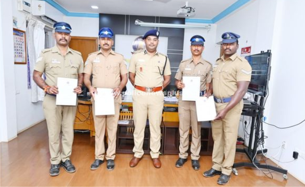 திருச்சி சரக காவல்துறை துணைத் தலைவர் அவர்களிடம் வெகுமதி பெற்ற பெரம்பலூர் மாவட்ட காவல்துறையைச் சேர்ந்த மேற்படி 4 காவலர்களை மாவட்ட காவல் கண்காணிப்பாளர் திரு.ச.மணி அவர்கள் வெகுவாக பாராட்டினார்.