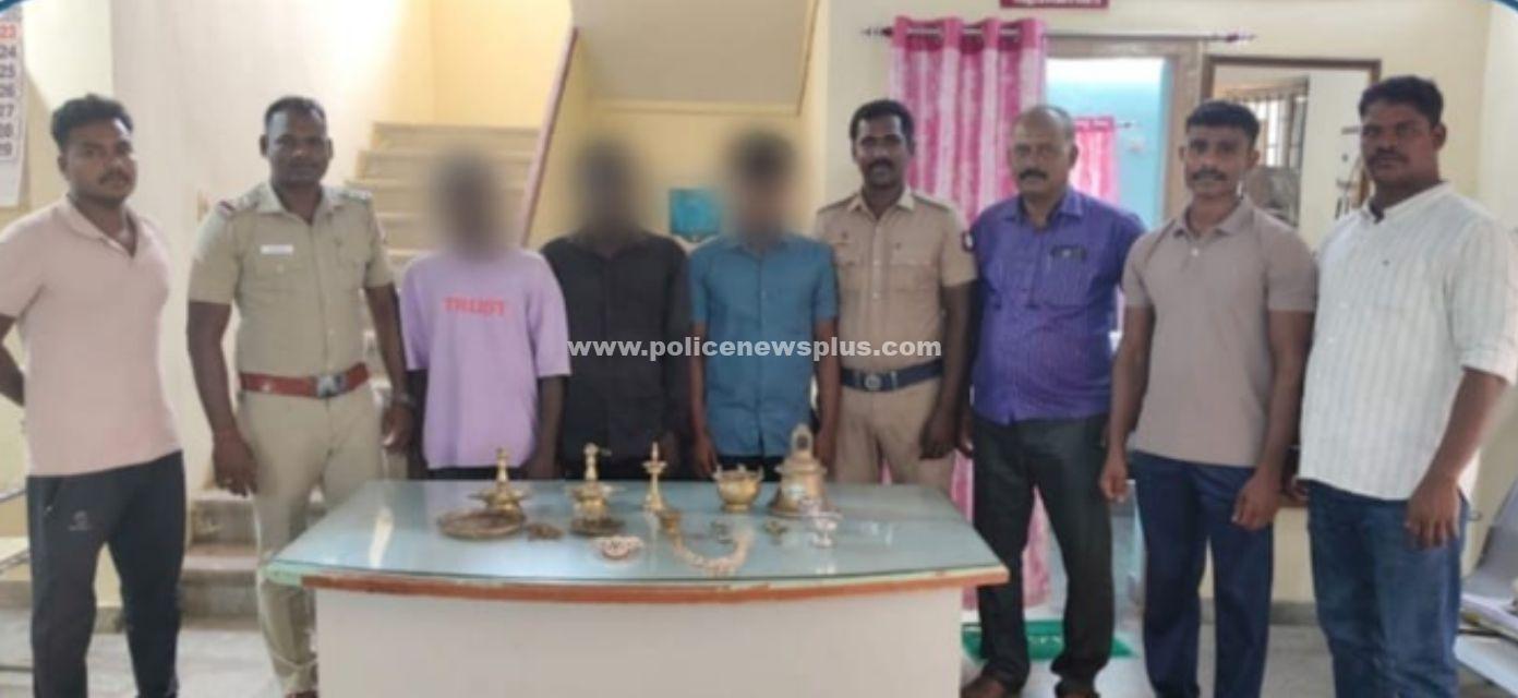 தூத்துக்குடி: தூத்துக்குடி மாவட்டம் டந்த (18.10.2025) அன்று தாளமுத்துநகர் காவல் நிலைய எல்லைக்குட்பட்ட சிலுவைப்பட்டி பகுதியில் உள்ள ஒரு விநாயகர் கோவிலிலின் பூட்டை உடைத்து கோயிலில் உள்ள வெண்கல மணி, கோயில் குத்துவிளக்கு, வெண்கல தட்டு உள்ளிட்ட ரூபாய் 20,000/- மதிப்புள்ள பூஜை பொருட்களை மர்ம நபர்கள் திருடி சென்றுள்ளனர். இது குறித்து கோயில் தர்மகர்த்தா (22.10.2025) அளித்த புகாரின் பேரில் தாளமுத்துநகர் காவல் நிலைய போலீசார் வழக்கு பதிவு செய்து விசாரணை மேற்கொண்டதில் தாளமுத்துநகர் பகுதியைச் சேர்ந்தவர்களான முத்துக்குமார் மகன் கருப்பசாமி (19). கருப்பசாமி மகன் பாலவிக்னேஷ் (22). மற்றும் மாரிமுத்து மகன் முகேஷ் (20). ஆகியோர் மேற்படி கோவிலின் பூட்டை உடைத்து பூஜை பொருட்களை திருடியது தெரியவந்தது.