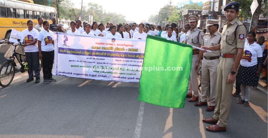 மதுரை : உலக மகளிர் தினத்தை முன்னிட்டு, மதுரை மாவட்ட காவல்துறையின் சார்பாக பெண் குழந்தைகள் மற்றும் பெண்களின் பாதுகாப்பு குறித்த விழிப்புணர்வு நடை பயணத்தை,