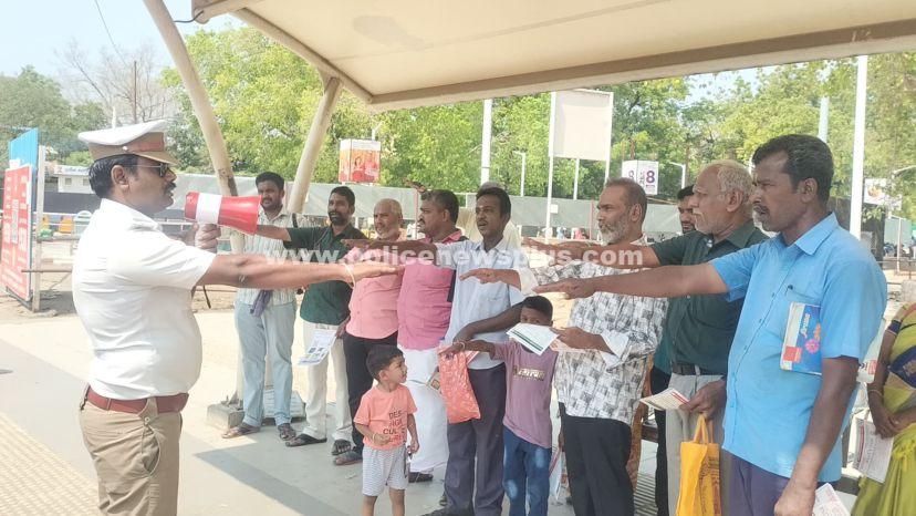 மதுரை: மதுரை திலகர் திடல் போக்குவரத்து காவல் ஆய்வாளர் தங்கமணி தலைமையில் ஆன காவலர்கள் மதுரை இரயில் நிலையம் அருகில் சாலையில் எப்படி கடப்பது இருபுறமும் வாகனம் வருகிறதா என்று பார்த்து கவனமாக செல்ல வேண்டும் எனவும் இருசக்கர வாகன ஓட்டிகள் வாகனத்தை மிதமான வேகத்தில் நகரில் இயக்க வேண்டும் எனவும் முதியவர்கள் மற்றும் மாற்றுத்திறனாளிகள் நடப்பதற்கு மிகவும் சிரமமாக இருக்கும் சாலையில் கிடக்கும் பொழுது நீங்கள் வேகமாக வந்தால் அவர்கள் மீது மோதி விபத்துக்கள் ஏற்பட உயிரிழப்புகளும் படுகாயங்களும் ஏற்பட அதிக அளவு வாய்ப்புகள் உள்ளது எனவும், இதனால் வாகன ஓட்டிகளும் மிகவும் கவனமாக செல்ல வேண்டும் எனவும், பேருந்தில் பயணம் செய்யும் பொழுது பேருந்து நின்ற பின்னே பேருந்தில் பின்புறம் வாயிலாகவே இருந்து இறங்க வேண்டும் எனவும் ஏறும் பொழுது முன் பகுதியில் ஏற வேண்டும் எனவும் உள்ளிட்ட பல்வேறு விழிப்புணர்வு துண்டு பிரசாரங்களை பயணிகளுக்கும் பாதசாரிகளுக்கும் மற்றும் இரு சக்கர வாகன ஓட்டிகளுக்கும் போக்குவரத்து காவல் ஆய்வாளர் தங்கமணி வழங்கினார் . இது பொதுமக்களிடையே மிகுந்த வரவேற்பை பெற்றது. இது போன்ற விழிப்புணர்வை இவர் தொடர்ந்து மேற்கொண்டு வருவதால், இப்பகுதியில் விபத்துக்கள் நடக்காமல் இருக்கிறது. இவரது முயற்சிக்கு பொதுமக்கள் அதிக அளவு பாராட்டுகளை தெரிவித்து வருகின்றனர்.