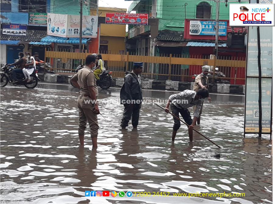 வேலூர் வடக்கு காவல் நிலையத்துக்கு உட்பட்ட சாலையில் மழைநீர் தேங்கி உள்ளதால் அவ்வழியாக வரும் வாகனங்கள் மற்றும் பொது மக்களுக்கு உதவும் விதமாக மழைநீரால் தேங்கிக்கிடந்த தண்ணீரை காவலர்களை கொண்டு சீரமைக்கப்பட்டுள்ளது.