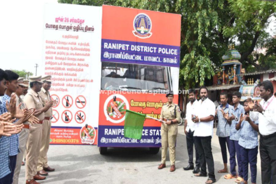 இராணிப்பேட்டை : சர்வதேச போதைப்பொருள் ஒழிப்பு தினத்தை முன்னிட்டு இராணிப்பேட்டை மாவட்ட காவல் கண்காணிப்பாளர் செல்வி.D.V கிரண் ஸ்ருதி, இ.கா.ப., அவர்கள், தலைமையில் இராணிப்பேட்டை அரசினர் மேல்நிலைப் பள்ளியில் போதை பொருள் எதிர்ப்பு விழிப்புணர்வு நிகழ்ச்சி மற்றும் உறுதிமொழி எடுக்கப்பட்டது. போதைப் பொருட்கள் ஒழிப்பு தலைப்பில் நடைபெற்ற ஓவியப்போட்டி மற்றும் கட்டுரைப் போட்டியில் வெற்றி பெற்ற மாணவ மாணவியர்களுக்கு மாவட்ட காவல் கண்காணிப்பாளர் அவர்கள் பரிசுகள் வழங்கி பாராட்டுகளை தெரிவித்தார். மேலும் போதைப் பொருள் தடுப்பு விழிப்புணர்வு வாகனம் துவக்க நிகழ்ச்சி நடைபெற்றது. இந்நிகழ்ச்சியில் இராணிப்பேட்டை மாவட்ட ஆட்சித் தலைவர் திருமதி.ச.வளர்மதி இ.ஆ.ப., அவர்கள், கலந்துக் கொண்டார்கள்.