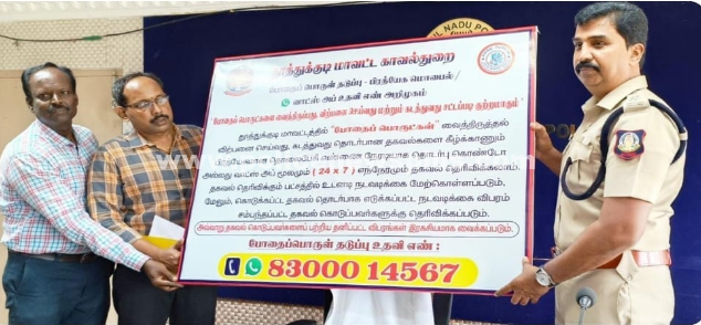 தூத்துக்குடி : தூத்துக்குடி மாவட்டத்தில், கஞ்சா மற்றும் போதைப் பொருட்களை முற்றிலும் ஒழிப்பதற்கு பல்வேறு நடவடிக்கைகள் எடுக்கப்பட்டு வருகிறது. போதைப்பொருள் இல்லாத மாவட்டமாக தூத்துக்குடி மாவட்டத்தை உருவாக்குவதே காவல்துறையின் நோக்கமாகும். இதற்கு பொதுமக்களின் ஒத்துழைப்பும் காவல்துறைக்கு தேவைப்படுகிறது. ஆகவே பொதுமக்கள் சமுதாயத்தின் மீது அக்கறையுணர்வுடன் தங்கள் பகுதிகளிலோ, பள்ளி மற்றும் கல்லூரி அருகிலோ, கடைகள் போன்ற பொது இடங்களிலோ கஞ்சா புகையிலை போன்ற போதைப் பொருள் விற்பனை மற்றும் கடத்தல் போன்ற தகவல் தெரிந்தால் செல்போன் எண் 83000 14567 என்ற எண்ணில் தொடர்பு கொண்டு தகவலாகவோ அல்லது வாட்ஸ் தகவலாகவோ 24 மணிநேரமும் தெரிவிக்கலாம்.