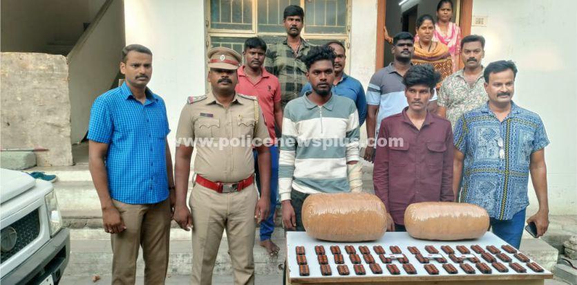 இதனை தொடர்ந்து அவர்களை மதுவிலக்கு அமலாக்கப் பிரிவு காவல் நிலையத்தில் வைத்து விசாரணை நடத்தியதில் மெரட்டூர் பகுதியை சேர்ந்த அஜய்(22). மற்றும் வடகரை பகுதியை சேர்ந்த விஸ்வா (20). ஆகியோர் எனவும், ஒடிசாவில் கஞ்சா மற்றும் போதை மாத்திரைகளை வாங்கி இரயில் மூலம் சூளூர்பேட்டை இரயில் நிலையம் வந்து, அங்கிருந்து பேருந்து மூலம் சென்னைக்கு கடத்தி சென்று சென்னை சுற்றுவட்டார பகுதிகளில் விற்பனை செய்ய எடுத்து சென்றது தெரிய வந்தது. இதனையடுத்து இருவரையும் கைது செய்து அவர்களிடம் இருந்து சுமார் 10 லட்ச ரூபாய் மதிப்பிலான 15 கிலோ கஞ்சா, 1300 போதை மாத்திரைகளை பறிமுதல் செய்தனர். தொடர்ந்து இருவரையும் கைது செய்து பொன்னேரி நீதிமன்றத்தில் ஆஜர்படுத்தப்பட்டு புழல் சிறையில் அடைக்கப்பட்டனர்.
