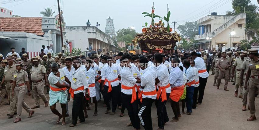 சிவகங்கை : சிவகங்கை மாவட்டம் காரைக்குடி அருகே தேவகோட்டையில் கண்டதேவி சொர்ணமூர்த்தீஸ்வரர் கோவில் புதிய தேர் வெள்ளோட்டம் வெகு சிறப்பாக நடைபெற்றது. ஏராளமான போலீஸ் பாதுகாப்புடன் தேவஸ்தான ஊழியர்கள் தேர் வடம் பிடித்து இழுத்தனர். நீதிமன்ற உத்தரவுபடி தேர் வெள்ளோட்டம் நடைபெறுவது குறிப்பிடதக்கது.