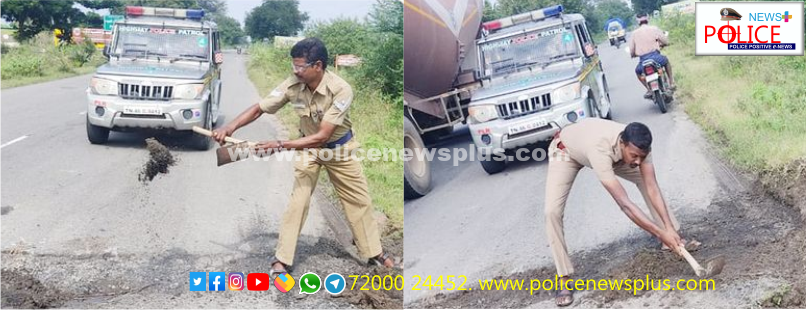 அதனை தடுக்க பெரம்பலூர் மாவட்ட நெடுஞ்சாலை ரோந்து எண்-4 காவல்துறையினரான தலைமைக் காவலர் திரு.இளையபெருமாள், முதல் நிலைக் காவலர் திரு.சரவணன் மற்றும் காவலர் திரு.பாஸ்கர், ஆகியோர்கள் மேற்படி இடத்தில் இருந்த பள்ளத்தினை அருகிலிருந்த மண்களை கொண்டு தற்காலிகமாக சரி செய்து பள்ளத்தினை சரி செய்தனர்.