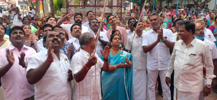 திண்டுக்கல் : திண்டுக்கல் 75 வது சுதந்திர தினத்தை முன்னிட்டு, திண்டுக்கல் மாநகராட்சி அலுவலகத்தில் தேசியக் கொடியை மேயர் திருமதி. இளமதி, அவர்கள் ஏற்றி வைத்து மரியாதை செலுத்தினர். பின்னர் பொதுமக்களுக்கு இனிப்பு வழங்கினார். இந்த நிகழ்ச்சி துணை மேயர் ராஜப்பா, மாநகராட்சி ஆணையாளர் மற்றும் ஏராளமான ஊழியர்கள் மற்றும் பொதுமக்கள் கலந்து கொண்டனர்.முன்னாதாக மாநகராட்சி அலுவலகத்தில் அமைந்துள்ள காந்தியின் திருவுருவ சிலைக்கு மேயர் மற்றும் துணை மேயர் மாலை அணிவித்து மரியாதை செலுத்தினர்.