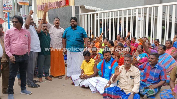 இதனைத்தொடர்ந்து, சாலை ஓரத்தில் அமர்ந்து சம்பளம் வழங்காததை கண்டித்து கோஷம் எழுப்பினர். வி .சி.க. துப்புரவு சங்க தொழிலாளர் முன்னணி நிர்வாகிகள் பூமிநாதன், டி.பி.ஐ. முத்து நெடுஞ்செழியன், உள்ளிட 100க்கும் மேற்பட்டோர் ஆர்பாட்டம் செய்தனர்.