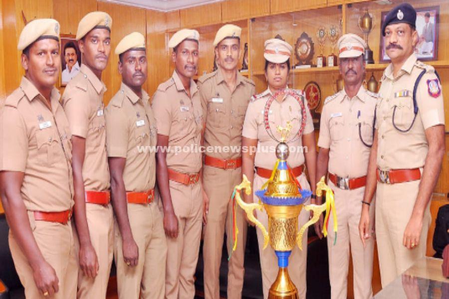 திருநெல்வேலி : தென்காசி மாவட்டம், அய்யாபுரம் , பகுதியில் மாநில அளவிலான கபாடி போட்டி, (30.12.2022) மற்றும் (31.12.2022) ஆகிய இரு தினங்கள் நடைபெற்றது. இப்போட்டியில் மதுரை, விருதுநகர், ராஜபாளையம், தென்காசி, சிவகங்கை, தூத்துக்குடி மாவட்டங்கள் உட்பட 67 அணிகள் பங்குபெற்றன. மேற்படி போட்டியில் திருநெல்வேலி மாவட்ட ஆயுதப்படையை சேர்ந்த இரண்டாம்நிலை காவலர்கள் திரு.நாகமணி, திரு.அஷின்ராஜ், திரு.வெற்றிவேல், திரு.சிவகாமி செல்வன், முத்துராஜா அடங்கிய கபாடி அணியினர் சிறப்பாக விளையாண்டு போட்டியில் இரண்டாம் இடம் பிடித்தனர். மேற்படி பரிசு பெற்ற காவலர்கள் இன்று வெற்றி கோப்பையுடன் திருநெல்வேலி மாவட்ட காவல் கண்காணிப்பாளர் திரு.சரவணன், இ.கா.ப, அவர்களை நேரில் சந்தித்து வாழ்த்து பெற்றனர். அப்போது மாவட்ட காவல் கண்காணிப்பாளர் அவர்கள் காவலர்களுக்கு வாழ்த்துக்கள் தெரிவித்து, அறிவுரைகள் வழங்கி ஊக்குவித்தார். இந்நிகழ்ச்சியில் மாவட்ட ஆயுதப்படை துணை காவல் கண்காணிப்பாளர் திரு.சுப்பிரமணியன், அவர்கள், மாவட்ட ஆயுதப்படை ஆய்வாளர் திருமதி.மகேஸ்வரி, ஆகியோர் உடனிருந்தனர்.