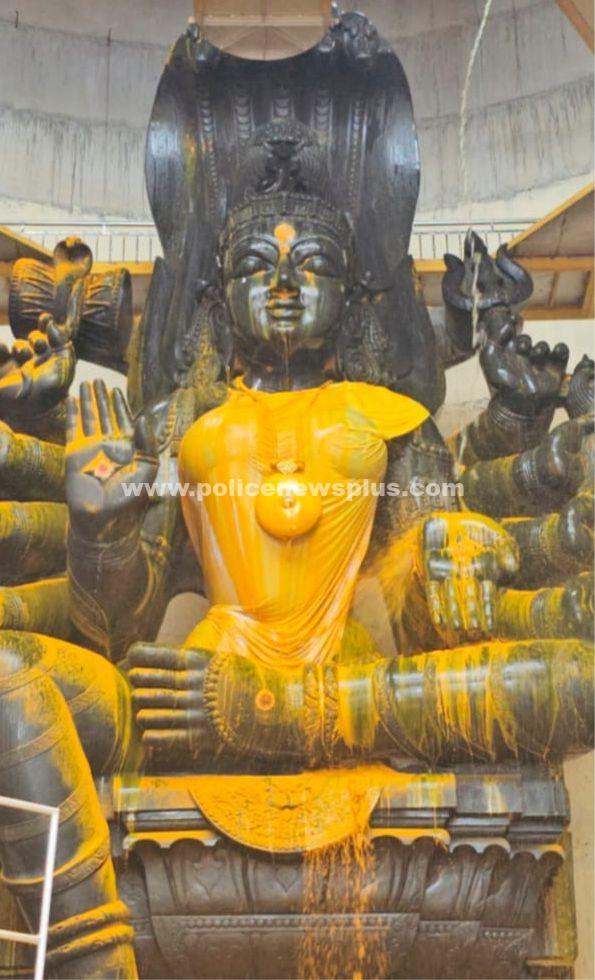 செங்கல்பட்டு: வெள்ளிக்கிழமை வரலட்சுமி விரதத்தை யொட்டி, திருவடிசூலத்தில் அமைந்துள்ள 41 அடி உயரமுள்ள தேவி ஸ்ரீ கருமாரியம்மன் கோயிலில் கருமாரி அம்மனுக்கு மகா அபிஷேகங்கள், சிறப்பு பூஜைகள் நடைபெற்றது. செங்கல்பட்டு அடுத்த திருவடிசூலம் கிராமத்தில் அமைந்துள்ள தேவி ஶ்ரீ கருமாரியம்மன் திருக்கோயில்புரம் பகுதியில் அமைந்துள்ள 51 சக்தி பீடங்களின் ஆதிசக்தியாக 51 அடி யில் ஆன தேவி ஸ்ரீ கருமாரியம்மனுக்கு ஆடி வெள்ளிக்கிழமை பெளர்ணமி, வரலட்சுமி விரதம் ஆகிய விழாவையொட்டி, ஆயிரம் குடங்களால் பாலபிஷேகமும், சுமார் 2,000 கிலோ மஞ்சள்தூள் அபிஷேகமும் நடைபெற்றது.