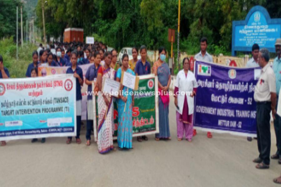 சேலம் : சேலம் மாவட்டம் மேட்டூர் நான்கு வழி சாலையில் சேலம் மாவட்ட அரவாணிகள் தாய் விழுதுகள் அறக்கட்டளை மற்றும் நம்பிக்கை மையம் இணைந்து உலக எய்ட்ஸ் தினமானது சமப்படுத்துதல் உறுதிமொழி மூலம் அனுசரிக்கப்பட்டது. மேட்டூர் அரசு தொழிற்பயிற்சி கல்லூரி மாணவ மாணவிகள் 400 பேர் மற்றும் பேராசிரியர்கள் விழிப்புணர்வு பேரணி மேட்டூர் சட்டமன்ற உறுப்பினர் திரு.சதாசிவம், நகரம் மன்ற தலைவர் திருமதி. சந்திரா, ஆகியோர் தலைமையில் விழிப்புணர்வு பேரணி நடத்தப்பட்டது. இதில் கலந்துகொண்டவர்கள் சேலம் மாவட்ட அரவாணிகள் தாய் விழுதுகள் அறக்கட்டளையின் திட்ட மேலாளர் மரியம்மாள், ஆலோசகர் குபேரன், ரம்யா, மற்றும் களப்பணியாளர்கள் நம்பிக்கை மையம் ஆலோசகர்கள் தமிழ்ச்செல்வி, தேவி, சந்திரன், ரவிக்குமார், ஆகியோர் கலந்துக்கொண்டனர்.