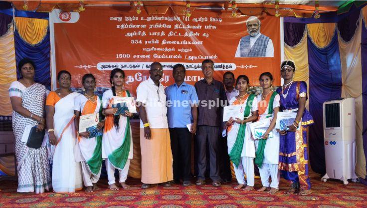 மதுரை: மதுரை கோட்டத்தில், இரயில் நிலையம் மேம்பாட்டிற்கான அடிக்கல் நாட்டும் விழா நடந்தது. இதில், சாலை வாகன போக்குவரத்து பாதுகாப்பிற்கும், ரயில் கடந்து செல்லும் வரை நீண்ட நேரம் காத்திருப்பதை தவிர்க்கவும், சோழவந்தான் ரயில் நிலையம் அருகே ரயில்வே மேம்பாலம் சுமார் 49 கோடி செலவில் அமைக்கப்பட்டுள்ளது. அந்த ரயில்வே மேம்பாலத்தை, பிரதமர் மோடி நாட்டுக்கு அர்ப்பணித்தார். இதற்கான காணொளி நிகழ்ச்சி விழா சோழவந்தான் ரயில் நிலைய வளாகத்தில் நடைபெற்றது. இவ்விழாவிற்கு, பாஜக மாவட்டப் பொருளாளர் முத்துராம், ரயில்வே பள்ளி மாணவிகளுக்கு பரிசு மற்றும் சான்றிதழ் வழங்கினார். மதுரை ரயில்வே கோட்ட உதவி கோட்ட பொறியாளர் முத்தையா வரவேற்றார். இந்நிகழ்ச்சியில், மதுரை ரயில்வே பள்ளி மாணவிகள் கலை நிகழ்ச்சி நடந்தது.