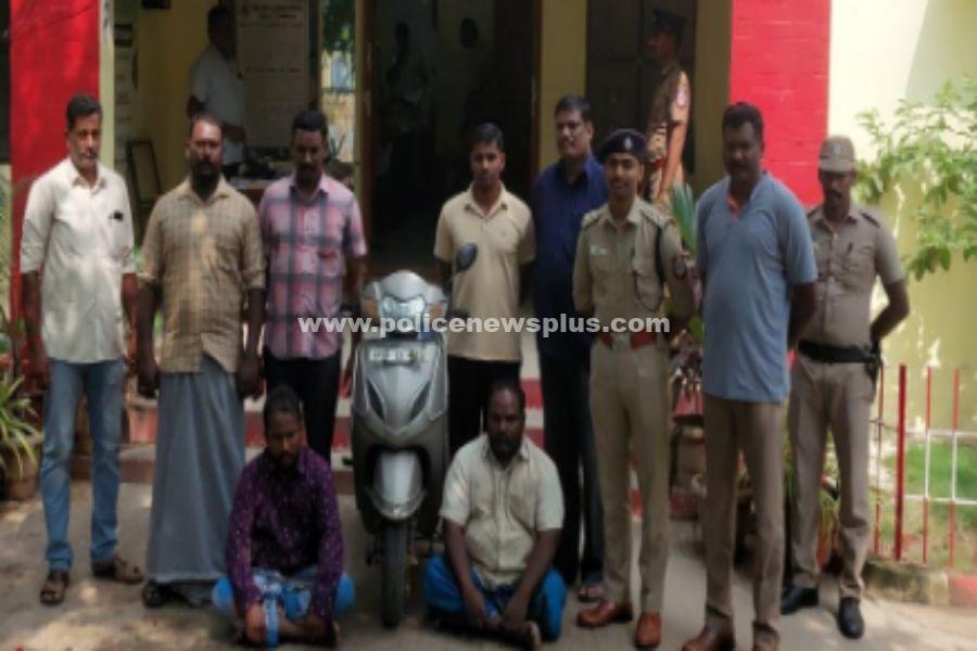 ராணிப்பேட்டை : ராணிப்பேட்டை மாவட்டம், அரக்கோணம் மங்கம்மா பேட்டை காவல்துறையினர் சோதனை சாவடி அருகே அரக்கோணம் நகர காவல் ஆய்வாளர் திரு,சாலமோன் ராஜா, பயிற்சி உதவி ஆய்வாளர் திரு.அருண்குமார், தலைமை காவலர் திரு.அப்துல் முஜீர், ஆகியோர் வாகன தணிக்கை செய்து கொண்டிருந்தபோது சந்தேகத்திற்கிடமான வகையில் இருசக்கர வாகனத்தில் வந்த ஆந்திர மாநிலம் OG குப்பத்தை சேர்ந்த துர்காராவ் (35) மகேந்திரா (38), ஆகிய இருவரையும் சோதனை செய்தபோது அவர்களிடம் இருந்து ஒன்றரை கிலோ கஞ்சா கடத்தலுக்கு பயன்படுத்திய இருசக்கர வாகனத்தை பறிமுதல் செய்து வழக்கு பதிவு செய்து இருவறை கைது செய்து விசாரணை நடத்தி வருகின்றனர்.