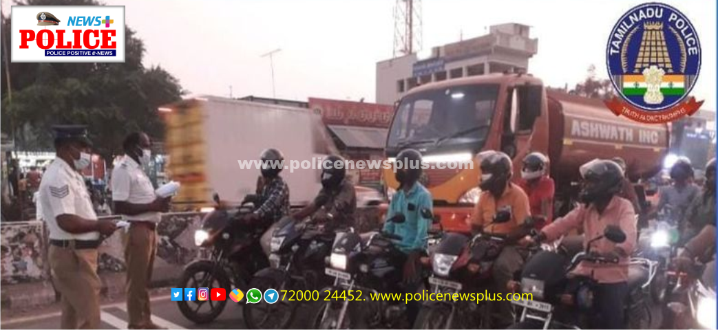 திருப்பூர்: திருப்பூர் மாவட்ட காவல் கண்காணிப்பாளர் திரு.கோ.சசாங் சாய். இ.கா.ப., அவர்களின் வழிகாட்டுதலின்படி பெருமாநல்லூர் போக்குவரத்து காவல்துறையினர் 4 ரோடு ஜங்ஷன் பகுதியில் வாகன ஓட்டிகளுக்கு சிக்னலில் கோட்டிற்கு முன்னதாகவே வாகனங்களை நிறுத்த வேண்டும் எனவும், தலைக்கவசம் அணிவதன் முக்கியத்துவம் குறித்தும் அறிவுரை வழங்கினார்கள். மேலும் பொதுமக்களுக்கு கொரோனா வைரஸ் பற்றிய அறிவுரை மற்றும் முகக் கவசம் வழங்கி விழிப்புணர்வு ஏற்படுத்தினார்கள்.