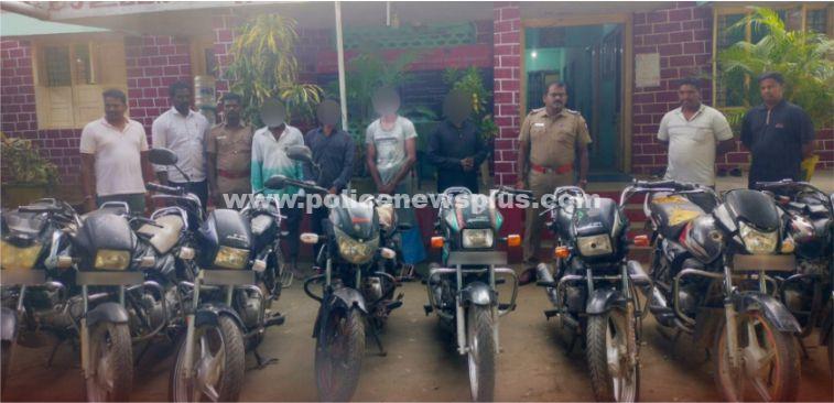 திருச்சி : திருச்சி மாவட்ட காவல் கண்காணிப்பாளர் திரு.செ.செல்வநாகரத்தினம், இ.கா.ப., அவர்களின் உத்தரவின்பேரில் திருச்சி மாவட்டம் முழுவதும் தீவிர வாகன சோதனை நடத்தப்பட்டு வந்த நிலையில் துறையூர் மற்றும் உப்பிலியபுரம் சுற்று வட்டார பகுதிகளில் தொடர் இருசக்கர வாகன திருட்டில் ஈடுபட்ட 4 நபர்கள் கைது செய்யப்பட்டு அவர்களிடமிருந்து 10 இருசக்கர வாகனங்கள் மீட்கப்பட்டுள்ளது. மேலும், வாகன திருட்டில் ஈடுபட்ட 4 பேர் மீதும் வழக்கு பதிவு செய்யப்பட்டு நீதிமன்ற காவலுக்கு உட்படுத்தப்பட்டுள்ளனர்.