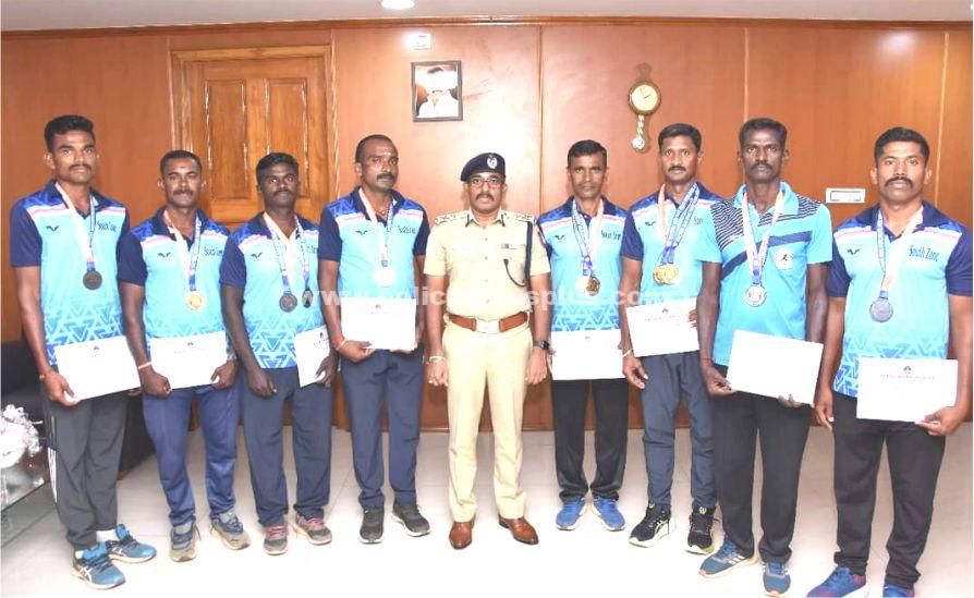 மதுரை: 63-வது தமிழ்நாடு மாநில காவல்துறை மண்டல தடகள போட்டிகள் கோவை மாவட்டத்தில் நடைபெற்றது. இதில், தென்மண்டல காவல்துறை அணி சார்பில் மதுரை மாநகரைச் சேர்ந்த சி.2-சுப்பிரமணியபுரம் காவல்நிலைய சார்பு ஆய்வாளர் குமரேசன், 200 மீட்டர், 400 மீட்டர் ஓட்டப்பந்தயங்களில் தங்கம்,வெள்ளி பதக்கங்களும், மதிச்சியம் காவல்நிலைய சிறப்பு சார்பு ஆய்வாளர் சிதம்பரம், 200 மீட்டர், 400 மீட்டர் ஓட்டப்பந்தயங்களில் வெள்ளி, வெண்கல பதக்கங்களும், மதிச்சியம் போக்குவரத்து தலைமை காவலர் செந்தில்குமார் 100 மீட்டர், 200 மீட்டர் ஓட்டப்பந்தயத்தில், வெண்கல மற்றும் வெள்ளி பதக்கமும், சைபர்கிரைம் காவல்நிலைய தலைமை காவலர் முனீஸ்வரன் நீளம் தாண்டுதலில் வெள்ளி பதக்கமும், கீரைத்துறை காவல்நிலைய தலைமை காவலர் முகமது முபாரக் 200 மீட்டர் மற்றும் 400 மீட்டர் ஓட்டப்பந்தயத்தில் வெண்கல பதக்கங்களும், சென்ட்ரல் போக்குவரத்து முதல்நிலை காவலர் இளையராஜா 1500 மீட்டர் ஓட்டப்பந்தயத்தில் தங்க பதக்கமும், தல்லாகுளம் காவல்நிலைய முதல்நிலை காவலர் சின்னபாண்டி மற்றும் ஆயுதப்படை காவலர் யோகேஸ்வரன் ஆகியோர் கோ-கோ விளையாட்டு போட்டியில் வெண்கல பதக்கம் வென்றனர். வெற்றிபெற்ற அனைவரையும் மதுரை மாநகர் காவல் ஆணையர் முனைவர். ஜெ.லோகநாதன், நேரில் அழைத்து ,தனது பாராட்டுக்களையும், வாழ்த்துக்களையும் தெரிவித்தார்.