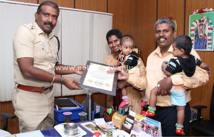 விருதுநகர் : விருதுநகர், சுலோச்சனா தெரு பகுதியைச் சேர்ந்தவர் மகேஸ்வரன் (32). இவரது மனைவி குருசரண்யா (26). இவர்களுக்கு 2 குழந்தைகள் உள்ளனர். இதில் இளைய மகன், அதிபன் பார்த்தசாரதி 10 மாத குழந்தையாக உள்ளார். இந்த 10 மாத குழந்தை உலக சாதனை புத்தகத்தில் இடம் பிடித்து ஆச்சரியப்படுத்தி உள்ளார். எப்போதும் துறுதுறுப்பாக இருக்கும் அதிபன் பார்த்திபன், கடந்த 7ம் தேதி 2 மாடி கட்டிடத்தில் உள்ள 34 படிகளை 4 நிமிடம், 20 விநாடிகளில் ஏறி சாதனை படைத்துள்ளார். இந்த சாதனையை அங்கீகரித்து நோபல் வேர்ல்ட் ரெக்கார்ட் நிறுவனம், 10 மாத குழந்தை அதிபன் பார்த்திபனுக்கு சாதனையாளர் விருது வழங்கியது. இந்த தகவலை அறிந்த விருதுநகர் மாவட்ட காவல் கண்காணிப்பாளர் ஸ்ரீனிவாசப்பெருமாள், சாதனை படைத்த குழந்தை அதிபன் பார்த்திபன், அவரது பெற்றோர்கள் மகேஸ்வரன், குருசரண்யா ஆகியோரை தனது அலுவலகத்திற்கு வரவழைத்து வாழ்த்துகள் வழங்கி பாராட்டு தெரிவித்தார். ‘விளையும் பயிர் முளையிலேயே’ என்ற முதுமொழிக்கேற்ப குழந்தை அதிபன் பார்த்திபன், வருங்காலங்களில் இன்னும் பல சாதனைகளை புரிய வேண்டும் என்று மாவட்ட காவல் கண்காணிப்பாளர் ஸ்ரீனிவாசப்பெருமாள் வாழ்த்து தெரிவித்து கூறினார்.