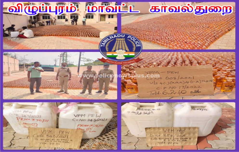 விழுப்புரம்: மதுவிலக்கு அமலாக்க பிரிவில் பல்வேறு வழக்குகளில் தொடர்புடைய 140 லிட்டர் சாராய கேன்கள் மற்றும் 6240 மதுபாட்டில்கள் இன்று (15.02.2022) விழுப்புரம் JM-II. திருமதி. பூர்ணிமா அவர்களின் மேற்பார்வையில் மாவட்ட மதுவிலக்கு பிரிவு காவல் துணை கண்காணிப்பாளர் திரு. ராஜபாண்டி, மதுவிலக்கு அமலாக்கப் பிரிவு ஆய்வாளர் திருமதி.கீதா, உதவி ஆய்வாளர் திரு.பிரகாஷ் அவர்களின் தலைமையில் கொட்டி அழிக்கப்பட்டது.