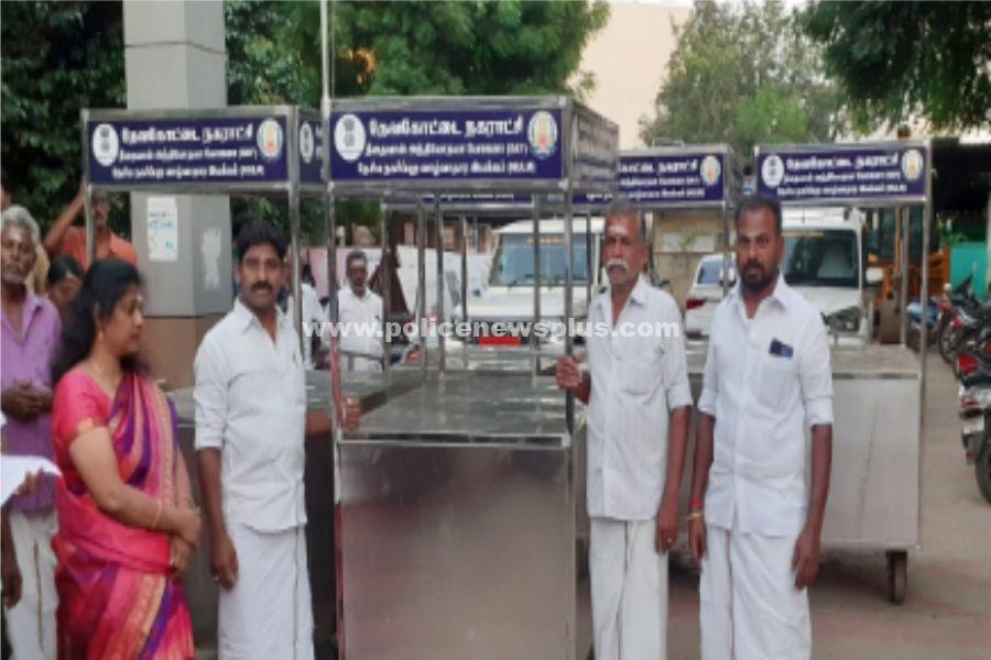 சிவகங்கை : தேவகோட்டை நகராட்சியில் 24 லட்சம் மதிப்பிலான நடமாடும் நவீன தள்ளுவண்டிகளை நகர் மன்ற தலைவர் திரு.சுந்தரலிங்கம், துணைத் தலைவர் திரு.ரமேஷ், ஆணையாளர் சாந்தி தலைமையில் பயனாளிகளுக்கு வழங்கினார்கள்.